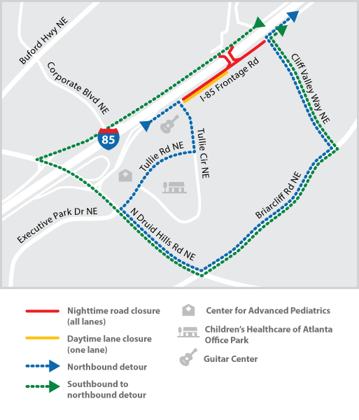 The I-85 Underpass between N. Druid Hills and Clairmont Road will be closed starting this Friday, Oct. 4 through Monday, Nov. 11.This temporary closure is required to safely construct the required infrastructure for this complex project. Signage is installed to direct traffic to detour options available for Northbound U-turns via Clairmont Rd. and Southbound U-turns via N. Druid Hills. We appreciate your patience as we work quickly to make these necessary improvements.